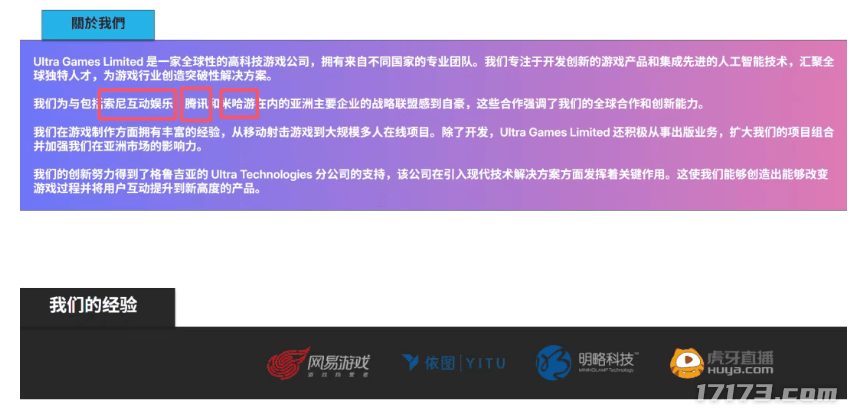对此,开发商Ultra Games Limited反手就把他们的“简历”给甩到了桌面上,称自己跟索尼、腾讯、米哈游结成了战略同盟,之前还服务过网易游戏、虎牙直播,反正是人手有人手,要技术有技术,有大厂支援有大厂支援,不愁游戏做不出来。