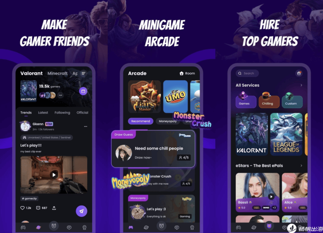 首先,「E-Pal」自身内置了部分小游戏功能,用户可直接加入游戏房,与陌生玩家进行互动或组队游玩。此外,平台为100多款热门游戏(如《Valorant》《League of Legends》《Fortnite》《Genshin Impact》《Apex Legends》等)建立了话题与群组,用户可在其中分享游戏录屏或展开讨论。