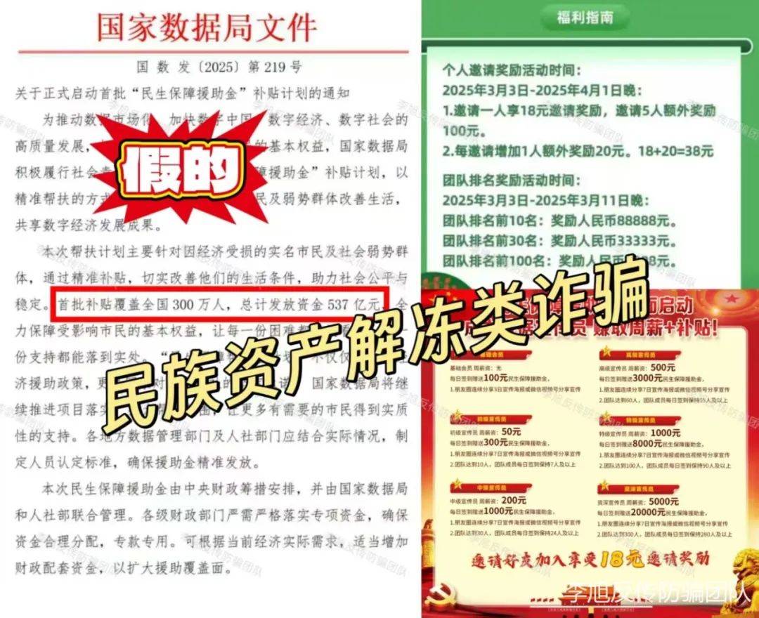 伪造国家“”谎称发放537亿“民生保障援助金”,忽悠人们实名注册加入。邀请新人获得现金奖励,根据团队人数排名还有额外奖励,设立6个级别发放周薪和补贴。